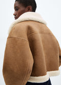 Leather effect. Heavy structure. Straight design. Short design. Shirt collar. Long sleeve. Two side pockets. Front zipper closure. Faux shearling interior. Shearling-lined design.