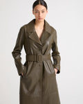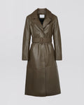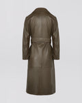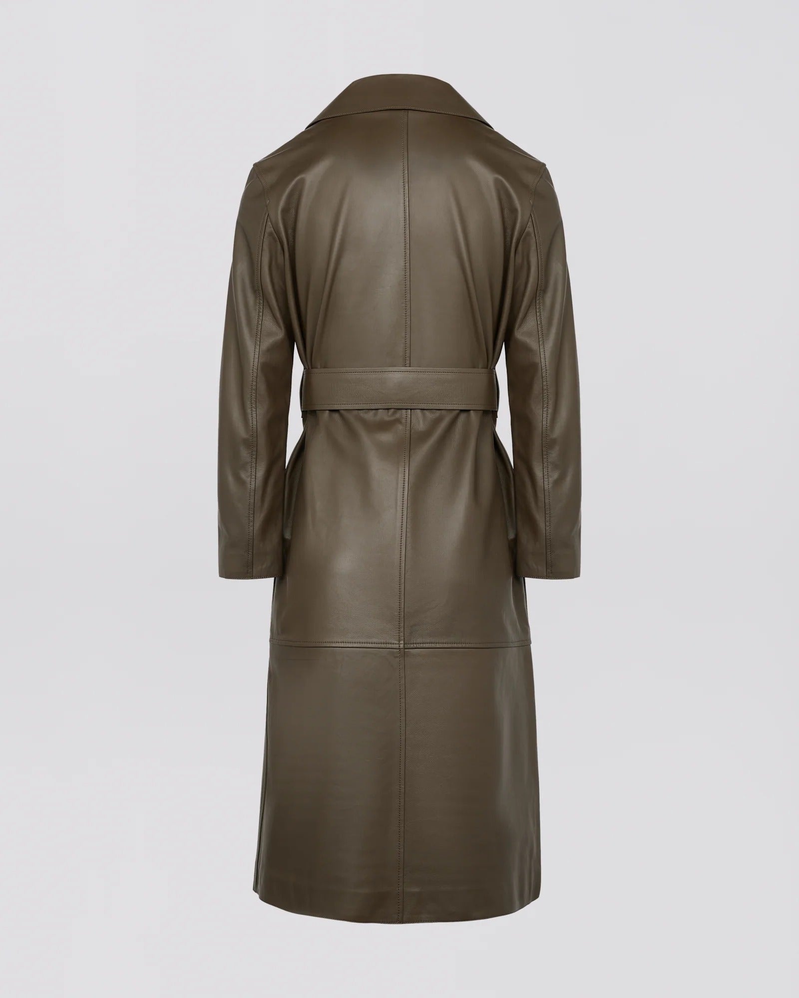 The impeccable lines of a long trench coat in supple leather, featuring a wide belt in the same material. Two side pockets allow for an elegant stance. A wide collar underlines the neck, giving a discreetly retro feel to the design.