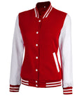 Elevate your style with our Womens Red and White Varsity Jacket, a timeless and stylish addition to your wardrobe. Crafted from high-quality materials, this jacket ensures both comfort and durability. Whether you're heading to a game or simply want to add a sporty touch to your outfit, this jacket is the perfect choice.
