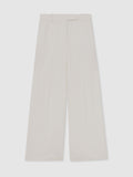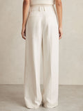 These white trousers are crafted from a lightweight linen blend, offering a relaxed yet polished silhouette. The wide-leg cut and pressed creases elevate the design, making them perfect for both casual and refined styling.