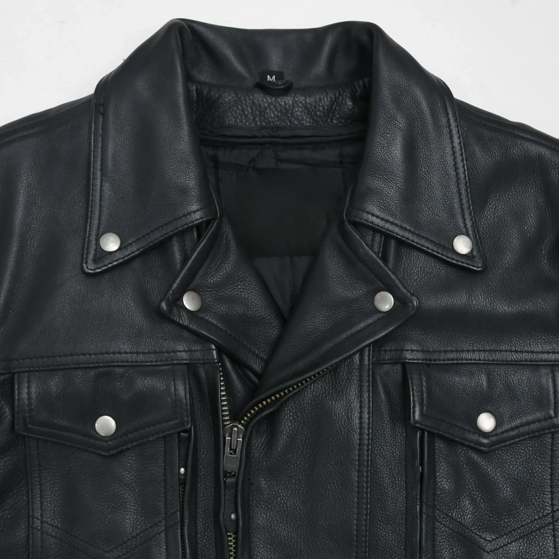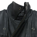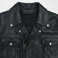 • Motorcycle style with snap down lapel, collar, and asymmetrical zipper