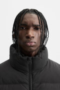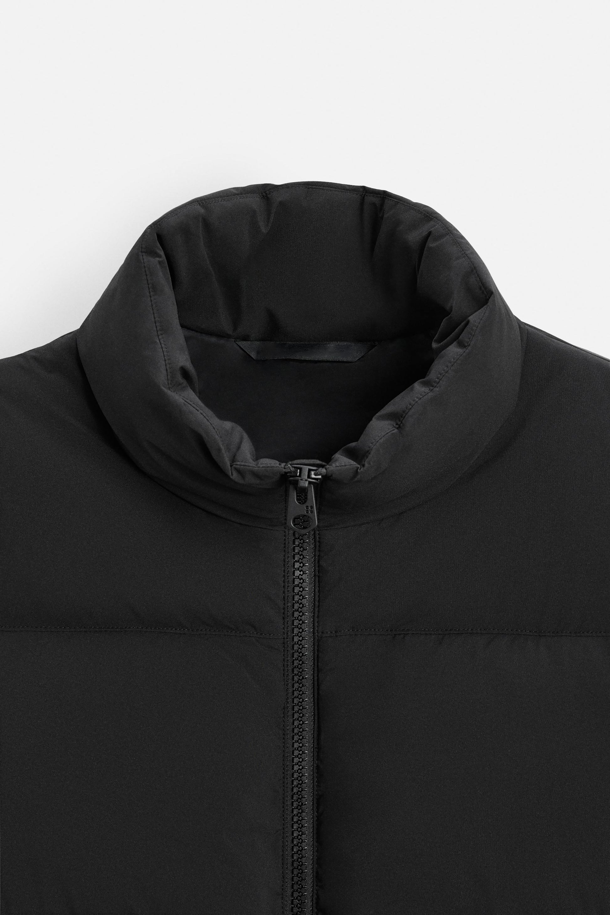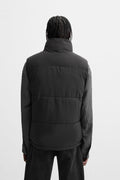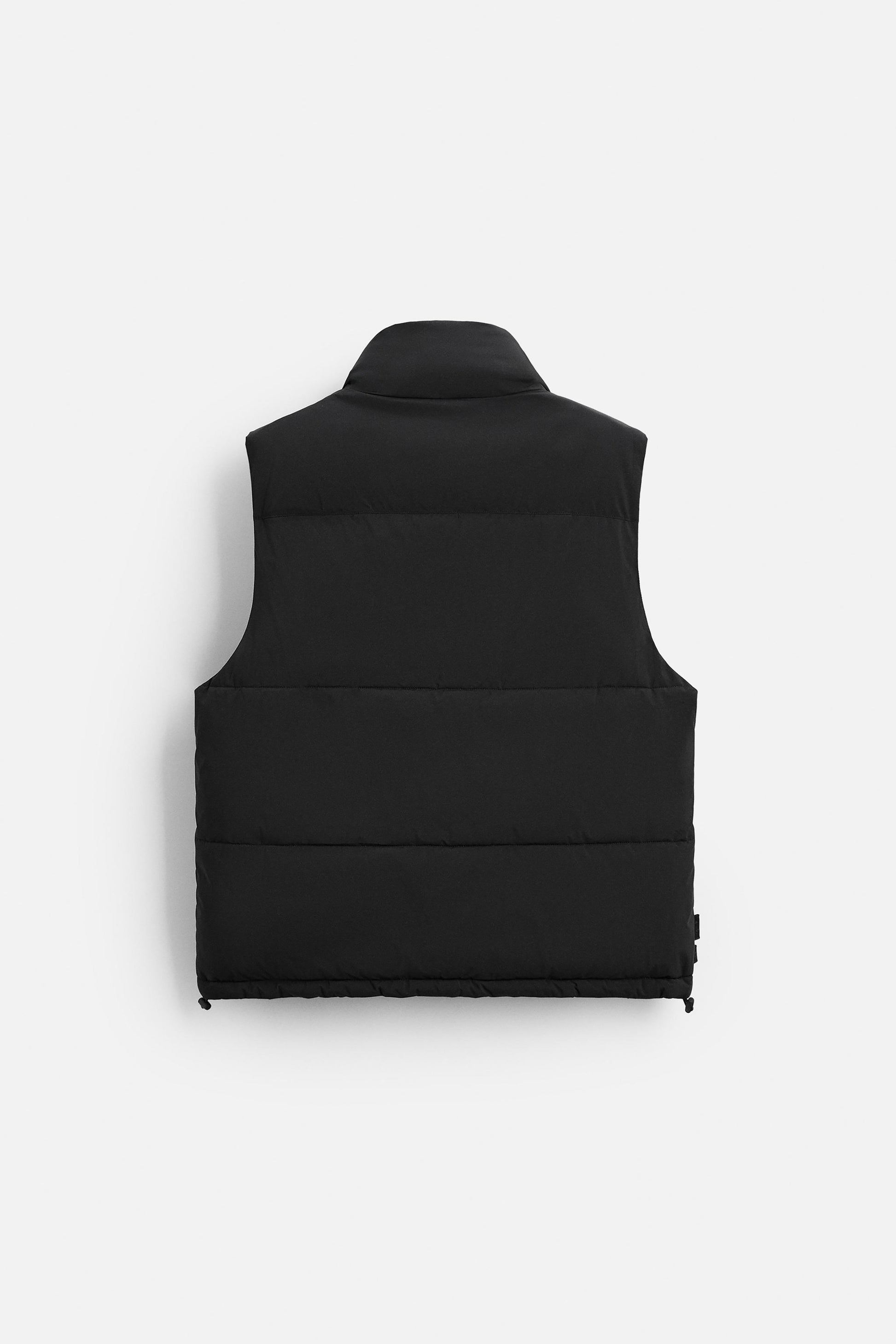 Padded gilet made of technical fabric. High neck and sleeveless. Welt pockets on the hips and inside pocket detail. Zip-up front.