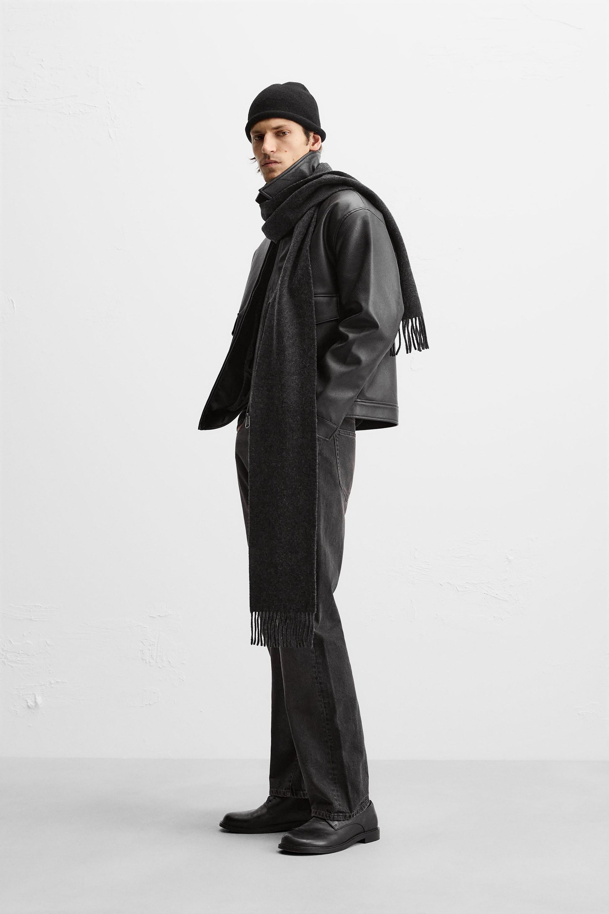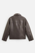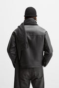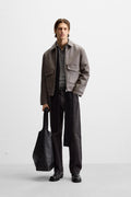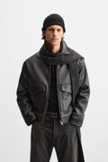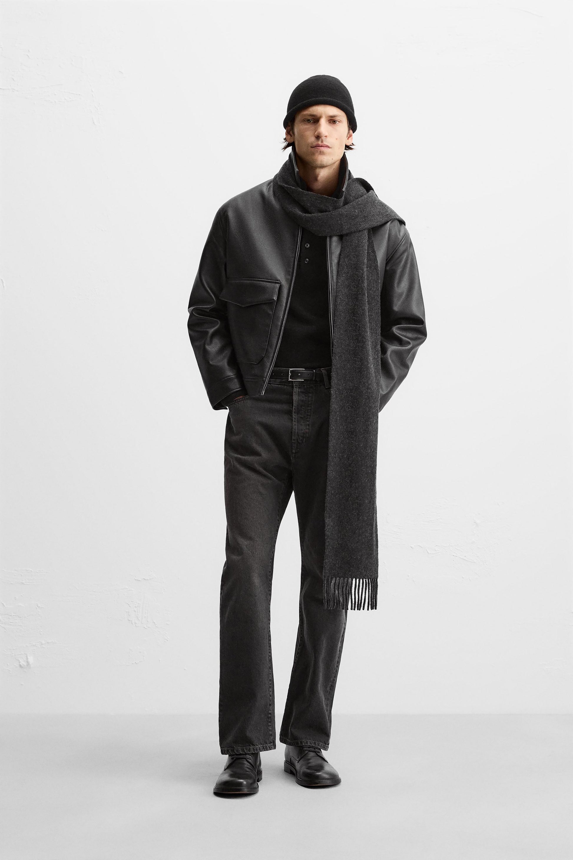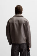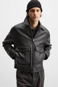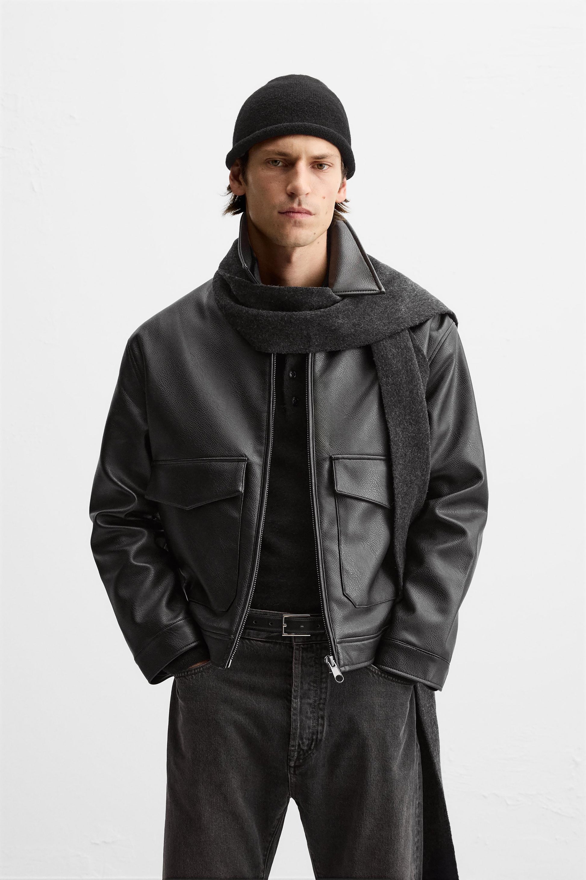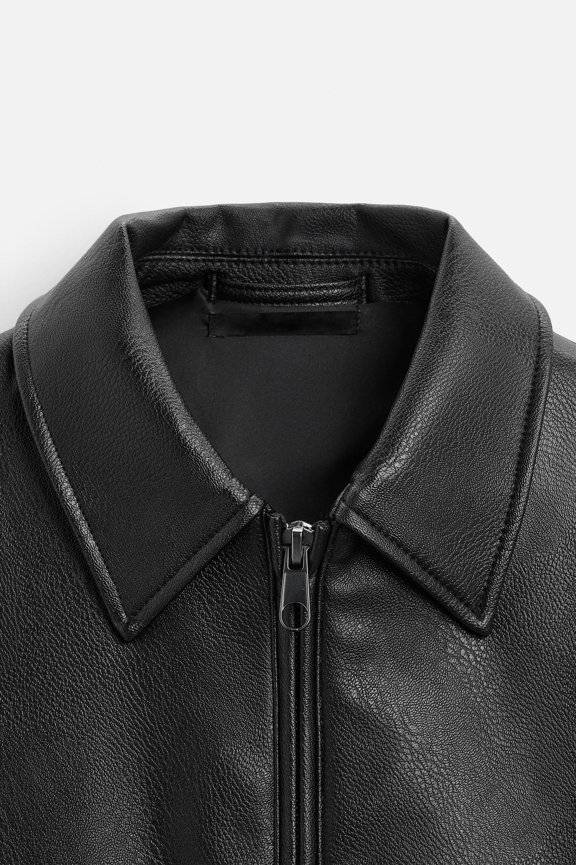 Regular fit jacket made of leather effect fabric and lightly padded inside. Lapel collar and long sleeves with buttoned cuffs. Patch pockets with flaps at the hip and inside pocket detail. Zip-up front.