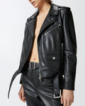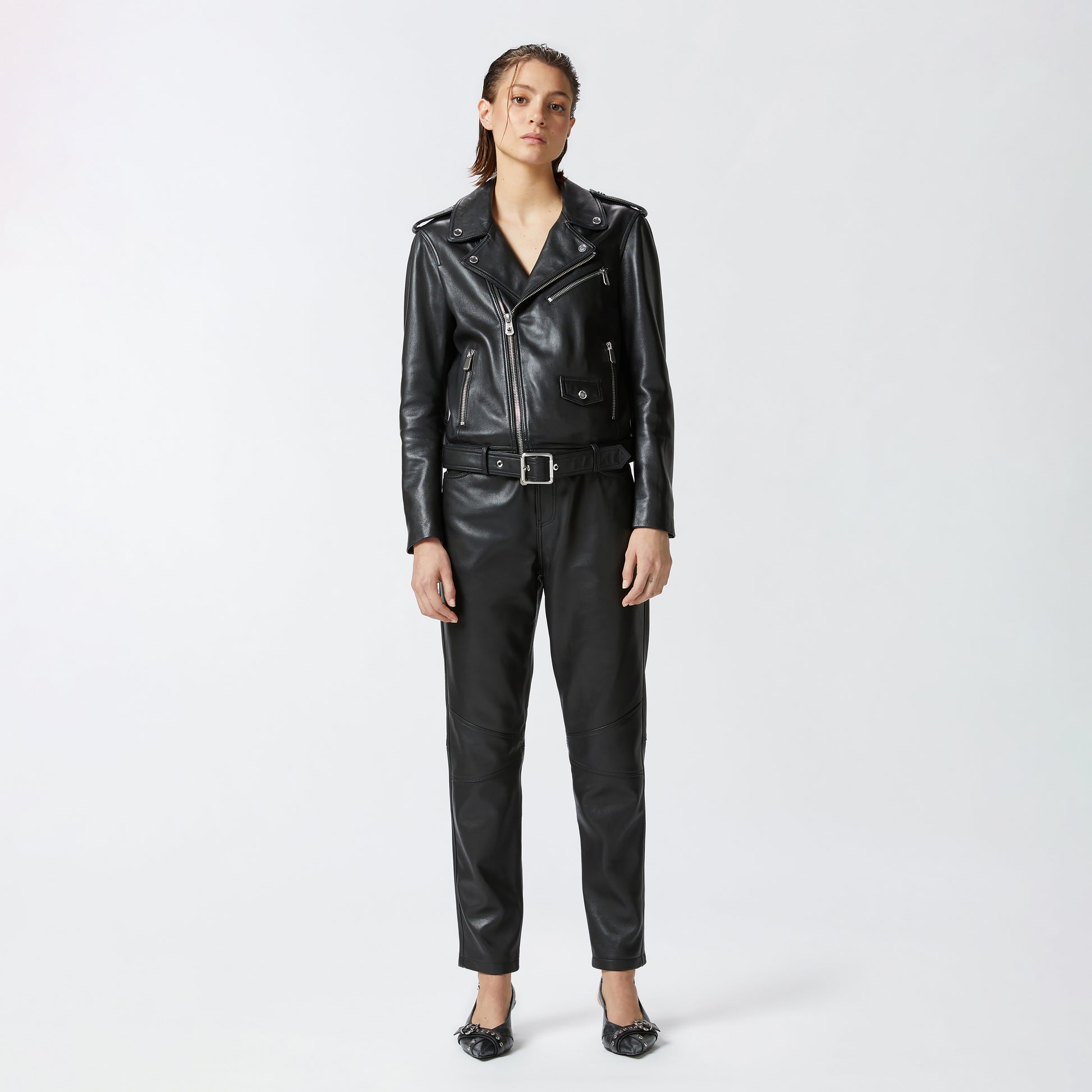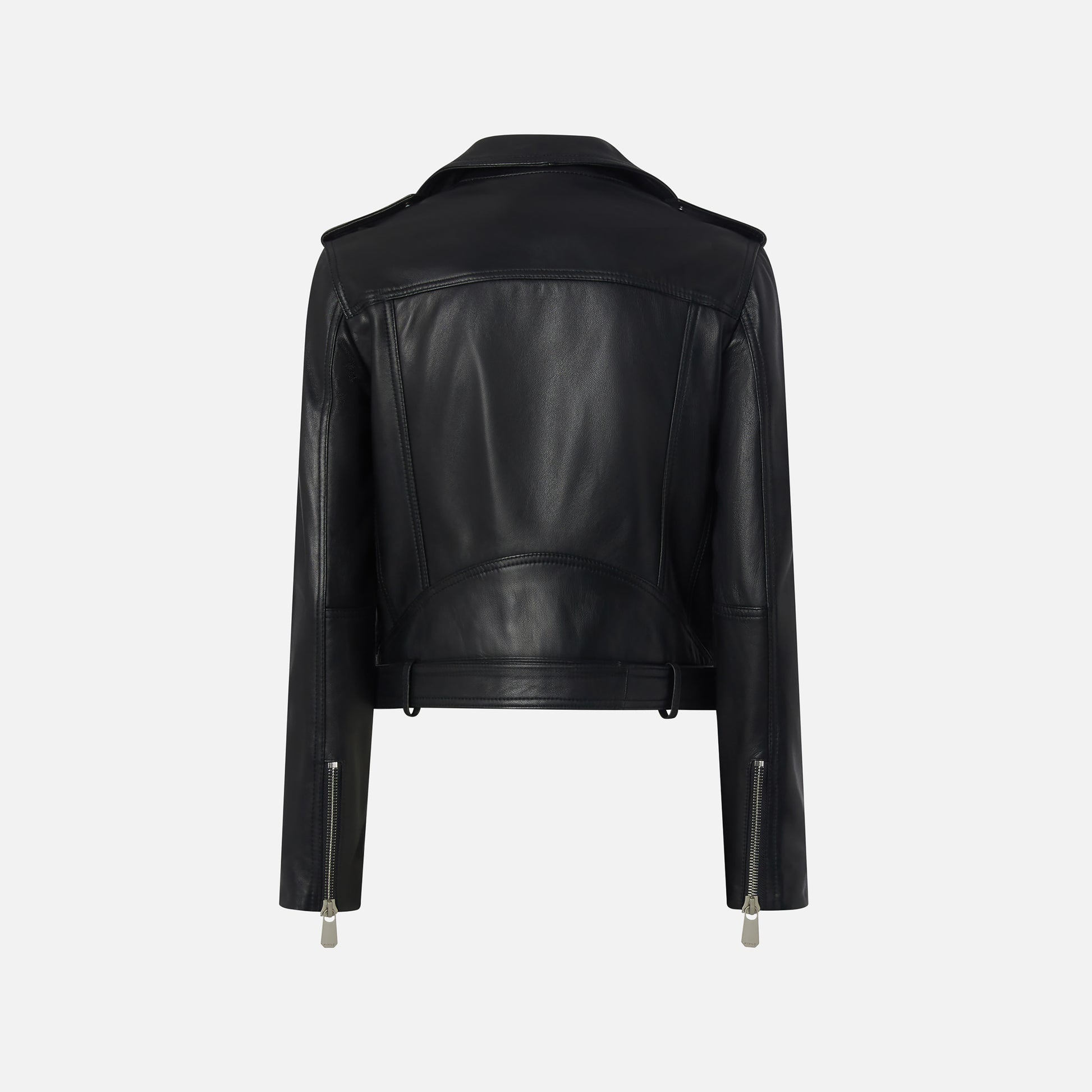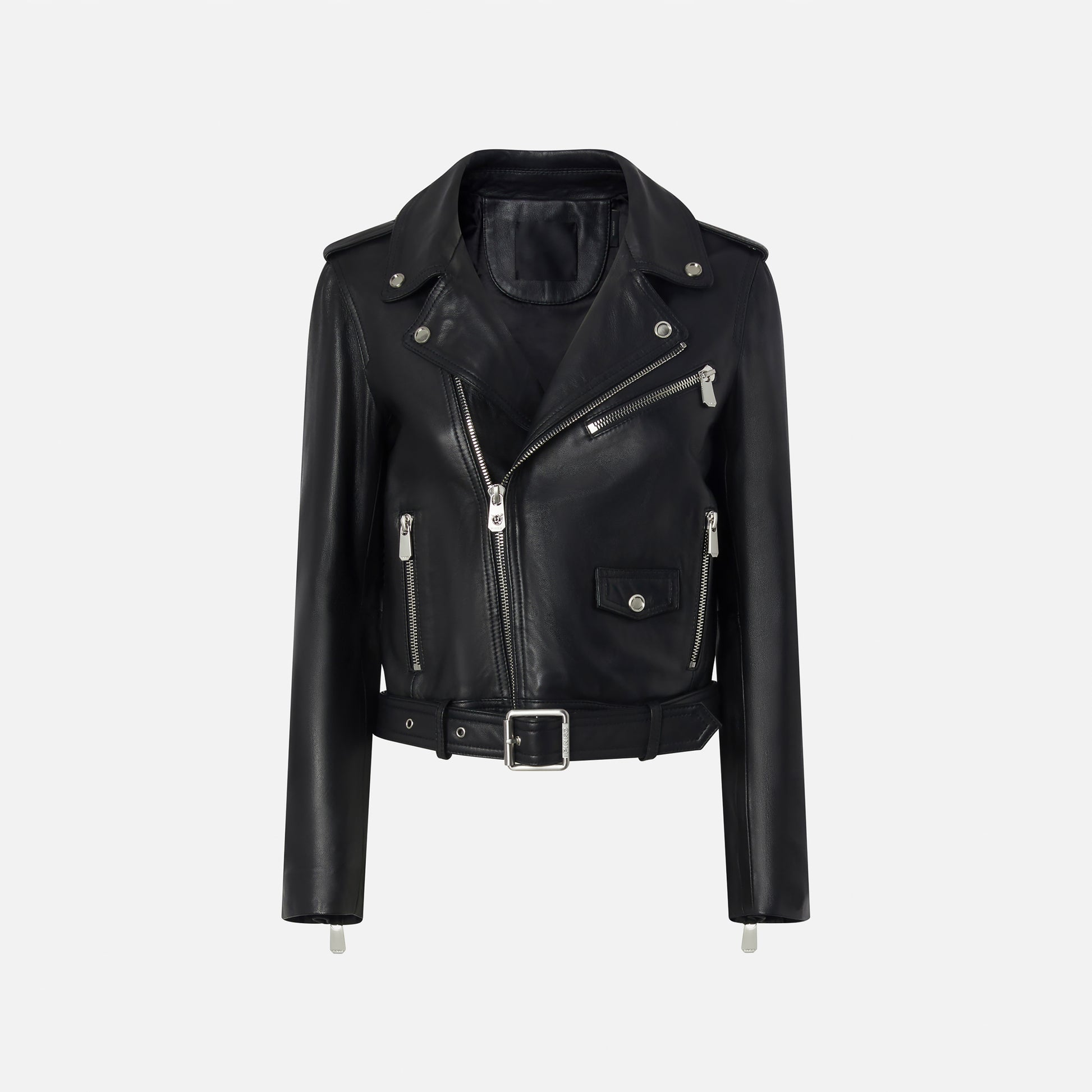 Biker-style jacket in soft nappa leather. Collar with metal buttons, long sleeves with epaulette and zipped cuff, slanted breast pocket and vertical zipped side pockets. The jacket has fabric lining and a belt at the bottom to tailor the fit. Asymmetric two-way metal zip fastening at the front.